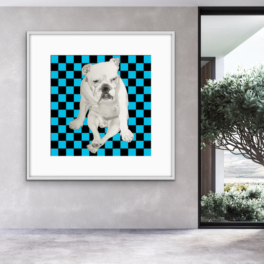 Shani Krebs' Bold Bulldog Collection reimagines a classic black-and-white bulldog photo against vibrant, neon checkered backgrounds. Inspired by Andy Warhol's pop art, each print contrasts the monochrome dog with bold hues and patterns, creating a playful yet striking visual. The series celebrates individuality, energy, and modern artistic flair.