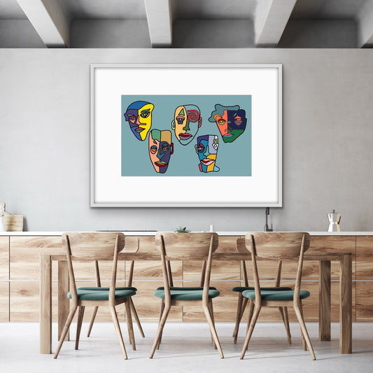 Shani Krebs’s funky faces collection bursts with personality and energy. Each print features bold expressions, vivid colors, and playful designs that capture the essence of individuality. The dynamic mix of abstract shapes and surreal details creates a whimsical celebration of diversity, humor, and the colorful tapestry of human emotion.